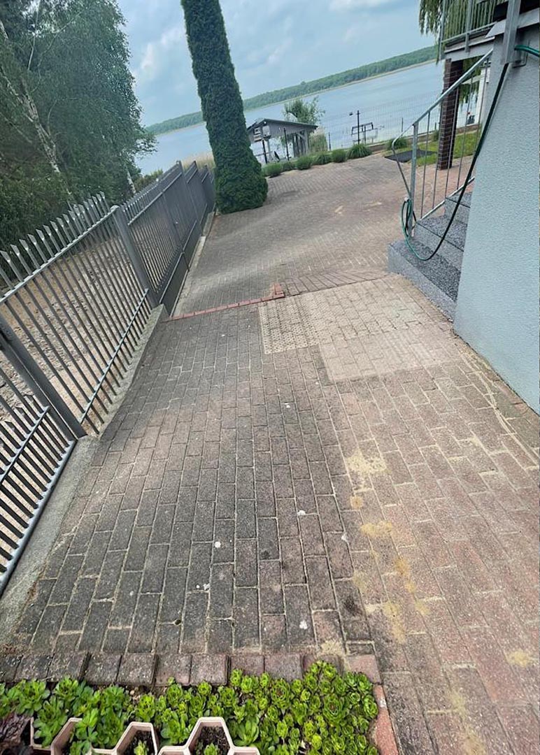 Czyścimy zarówno kostkę brukową, jak i elewacje oraz dachy, zapewniając spójny efekt estetyczny.