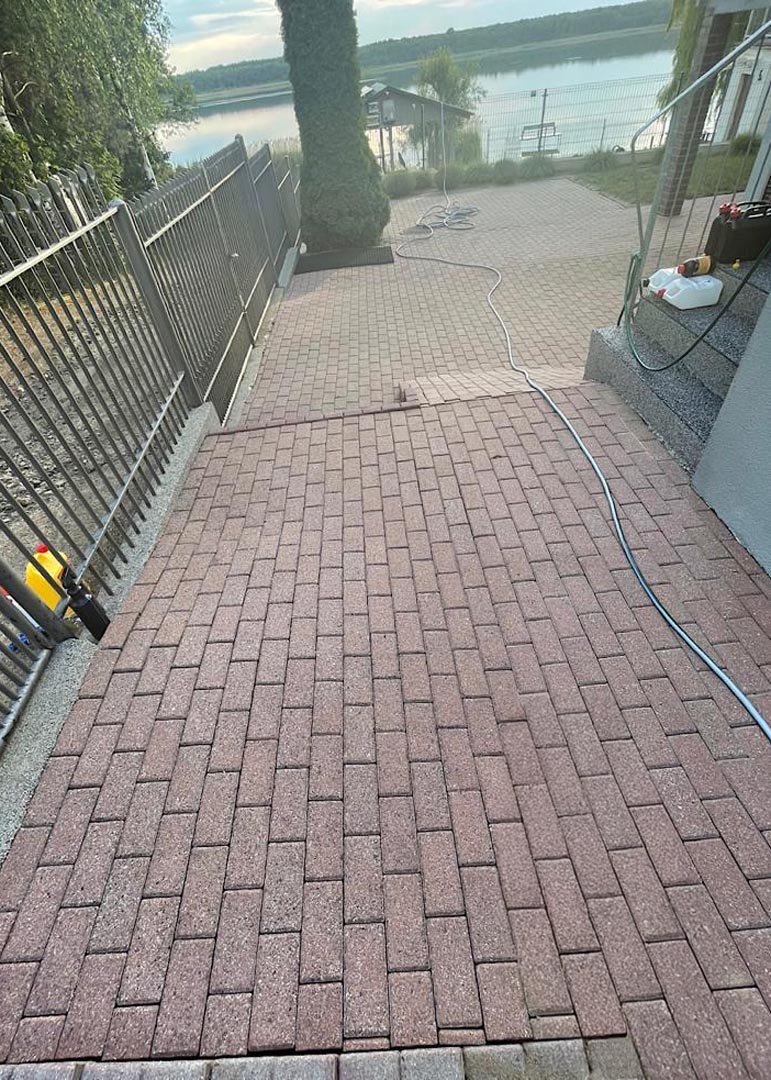 Czyścimy zarówno kostkę brukową, jak i elewacje oraz dachy, zapewniając spójny efekt estetyczny.